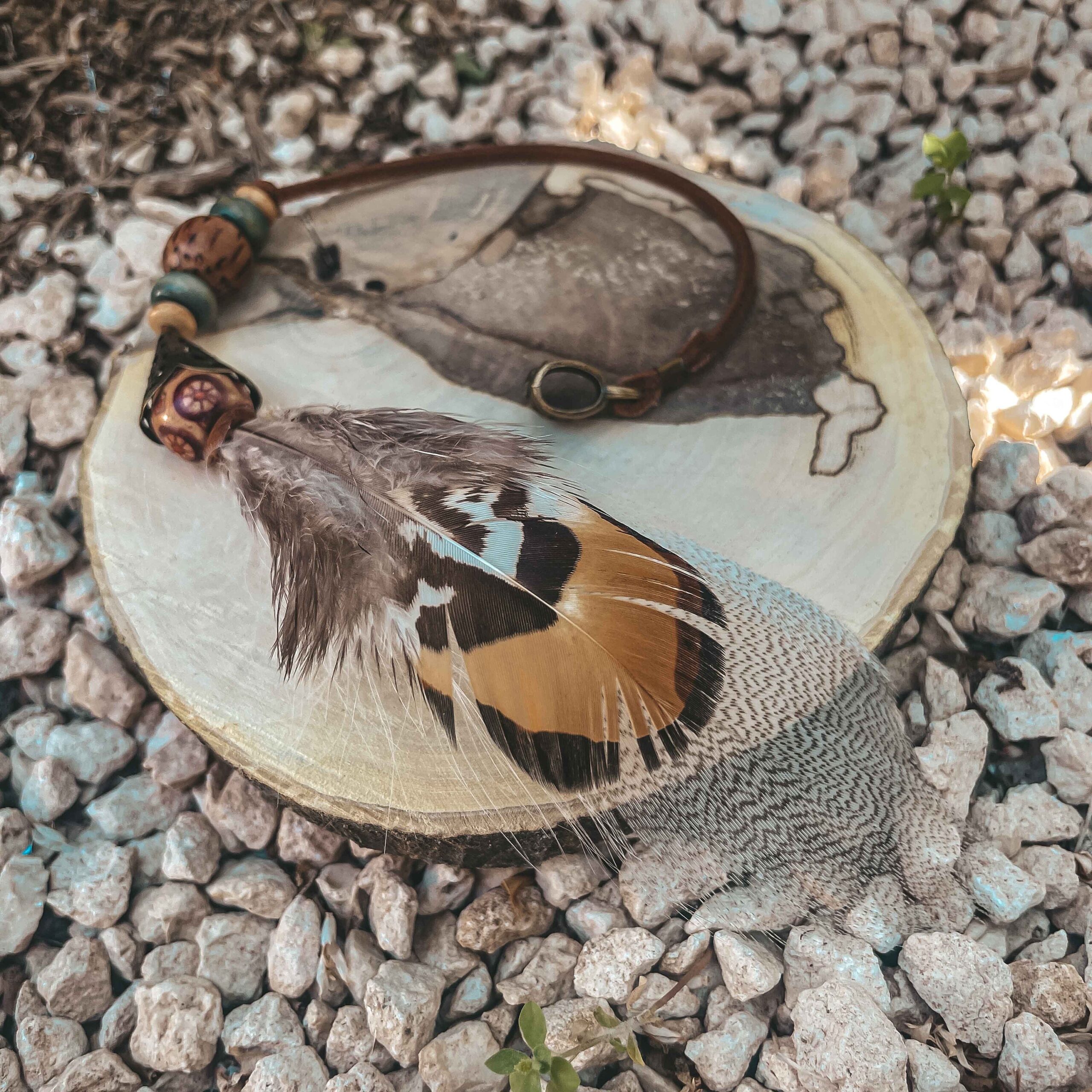 A beautiful handmade feather dreadlock bead hair decoration. The feather bead is made with natural feathers, wooden beads a brown fake suede strand and an antique bronze large bead to fit your dreads through. Wear it and compliment your style.