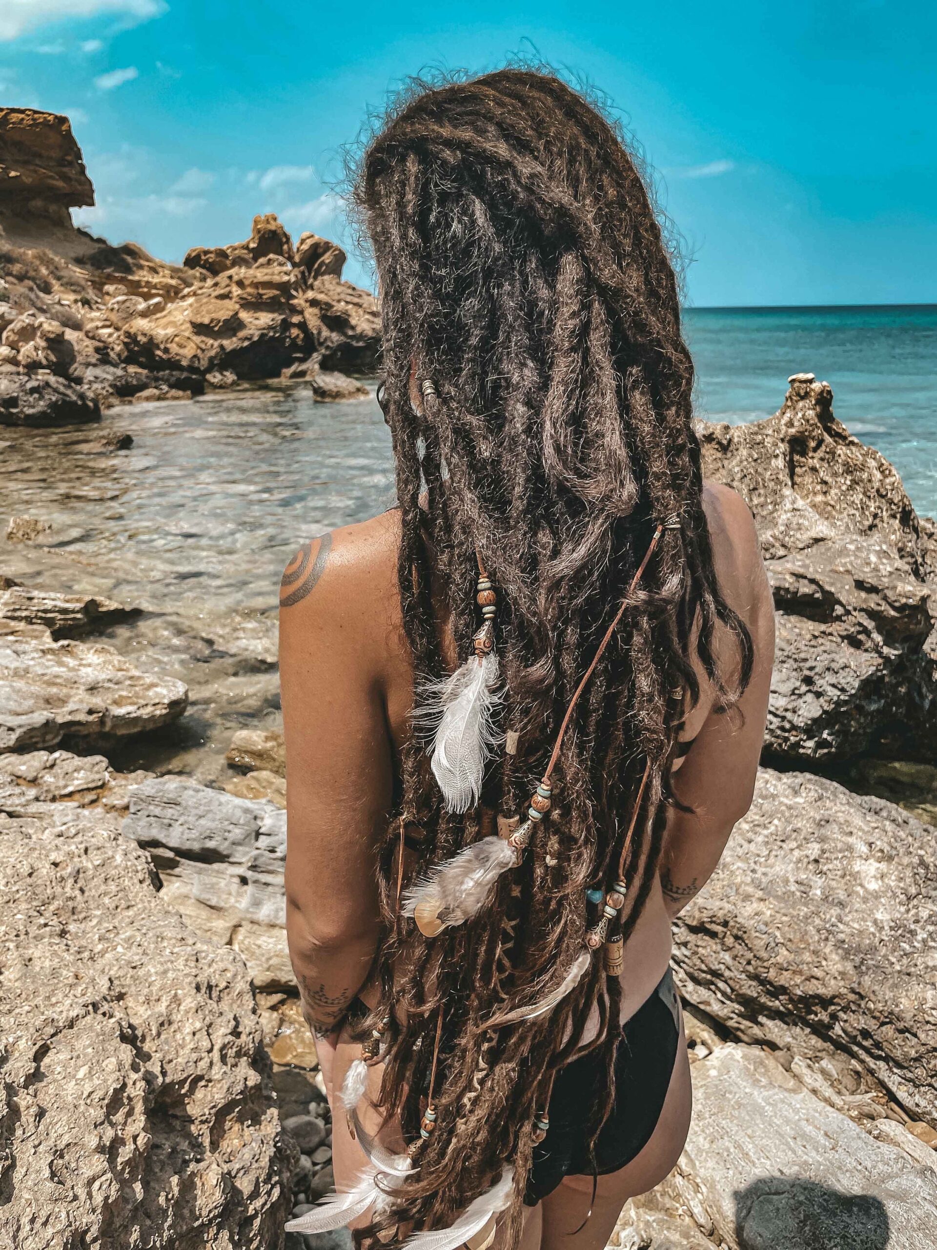 You will receive one feather dreadlock bead decoration in a lovely stamped cotton bag.